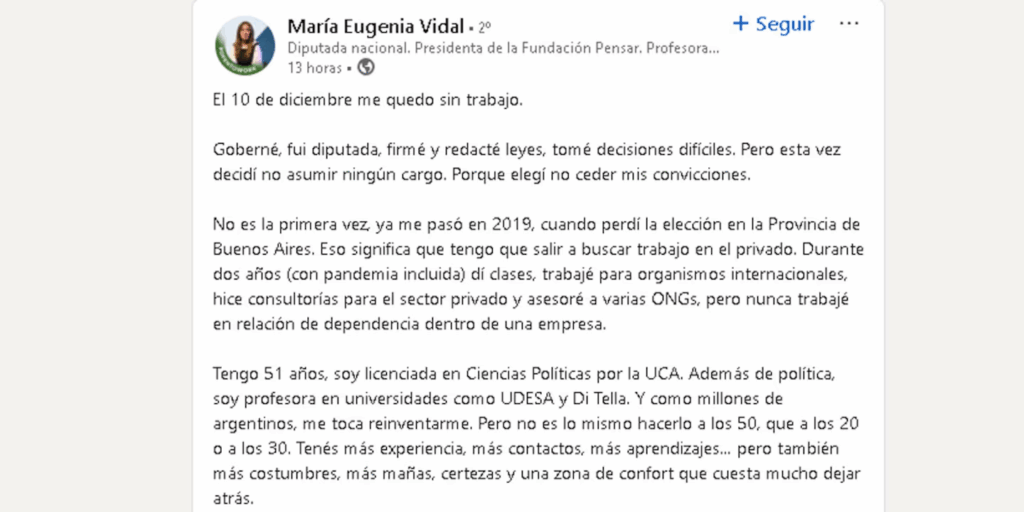 Como carta de presentación, indicó sus habilidades y experiencia: “Goberné, fui diputada, firmé y redacté leyes, tomé decisiones difíciles. Pero esta vez decidí no asumir ningún cargo. Porque elegí no ceder mis convicciones”, dice su mensaje en la red social de búsqueda laboral.