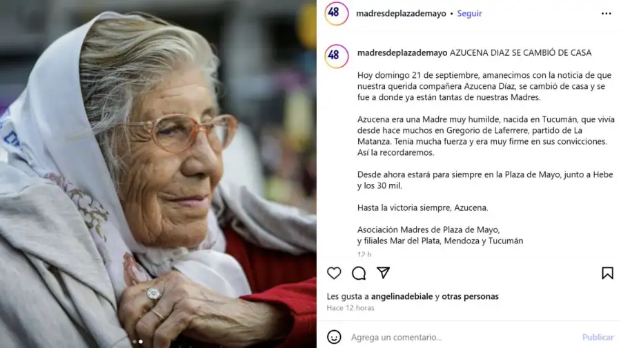 La referente de Madres de Plaza de Mayo, Azucena Díaz, quien dedicó toda su vida y esfuerzo a la lucha por la Memoria, la Verdad y la Justicia y a la búsqueda de su hijo Manuel Taján, desaparecido durante la última dictadura militar, falleció este domingo. A partir de un comunicado difundido en redes sociales, la asociación la despidió destacando su ejemplo de perseverancia: «Tenía mucha fuerza y era muy firme en sus convicciones. Así la recordaremos».