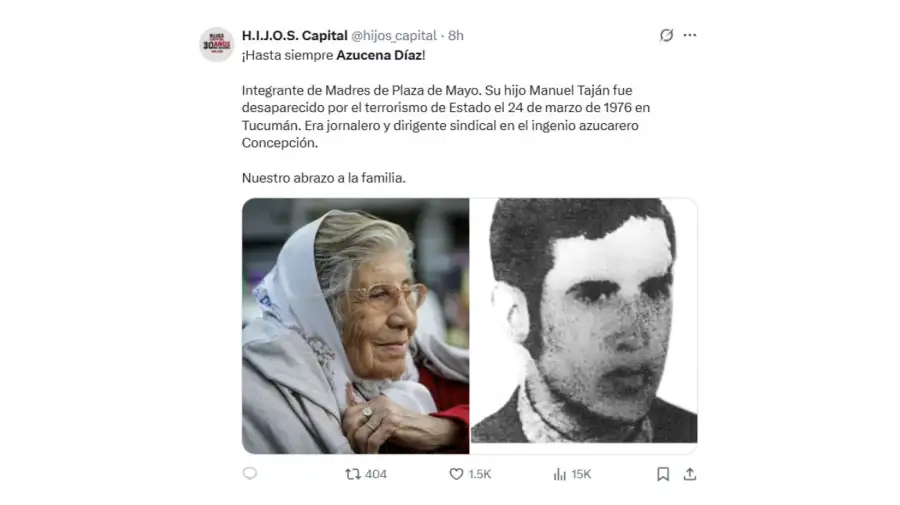 La agrupación Hijos e Hijas por la Identidad y la Justicia contra el Olvido y el Silencio (HIJOS) Capital la despidió a a través de sus redes sociales, con profundo respeto y cariño: «¡Hasta siempre Azucena Díaz! Integrante de Madres de Plaza de Mayo. Su hijo Manuel Taján era jornalero y dirigente sindical en el ingenio azucarero Concepción», señalaron.