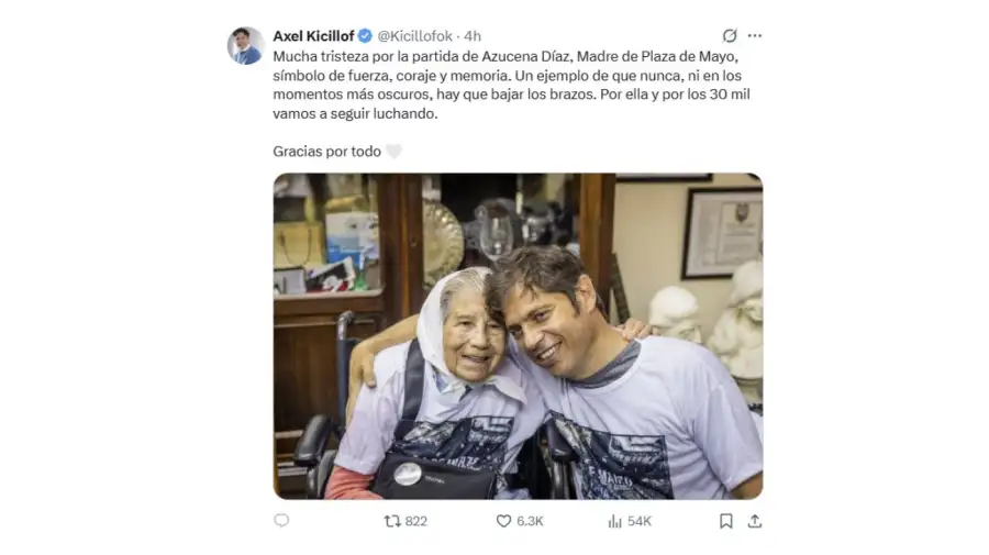 A la par, el gobernador de la provincia de Buenos Aires, Axel Kicillof, también expresó su pesar: «Con profundo dolor despedimos hoy a Azucena Díaz, Madre de Plaza de Mayo y luchadora incansable por la Memoria, la Verdad y la Justicia. Seguiremos honrando su ejemplo y su legado», escribió en sus redes. De manera simultánea, el ministro de Gobierno bonaerense, Carlos Bianco, envió sus condolencias a familiares y allegados de la referente de derechos humanos.