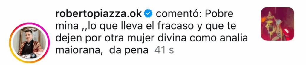 Entre ellos, destaco el comentario que el polémico diseñador Roberto Piazza dejó en un posteo de Instagram: “Pobre mina, lo que lleva el fracaso y que te dejen por otra mujer divina como Analía Maionara, da pena”.