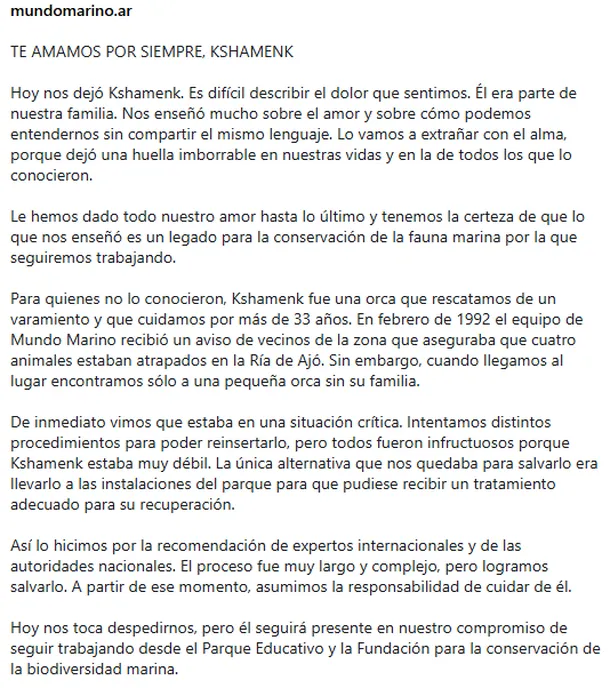 “Hoy nos dejó Kshamenk. Es difícil describir el dolor que sentimos. Él era parte de nuestra familia. Nos enseñó mucho sobre el amor y sobre cómo podemos entendernos sin compartir el mismo lenguaje. Lo vamos a extrañar con el alma, porque dejó una huella imborrable en nuestras vidas y en la de todos los que lo conocieron”, expresaron desde Mundo Marino en una publicación compartida en las redes sociales.